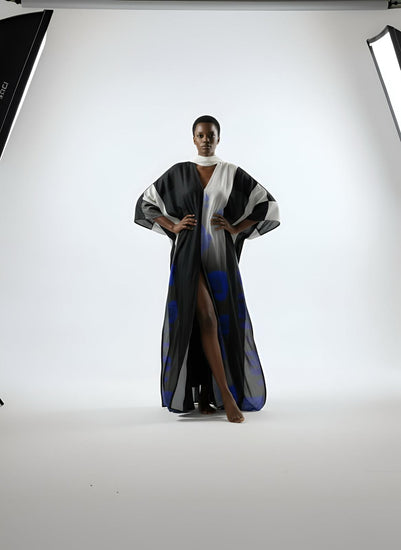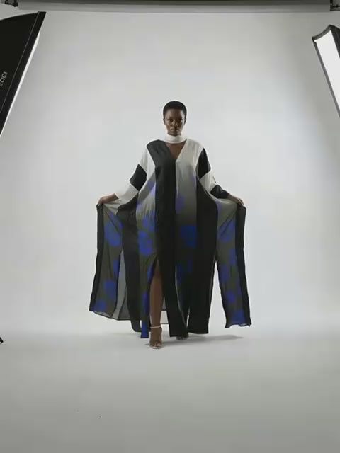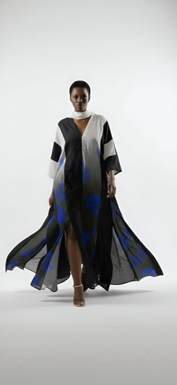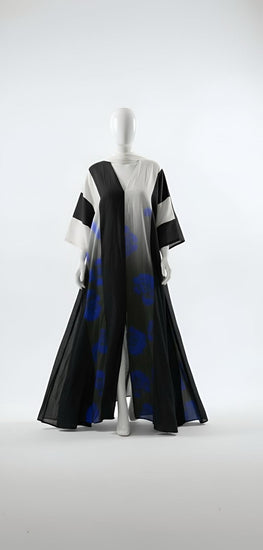 A study in modern artistic contrast, the Sarei Bubu is the height of "quiet luxury." Made from ultra-lightweight pure silk, it features sophisticated color-blocking in black and white, punctuated by deep azure floral accents at the hem. The Sarei comes with an integrated silk neck-scarf detail, offering multiple styling options for a statuesque, editorial finish. Designed for the global woman who values craftsmanship and contemporary abstract art.