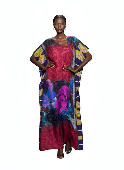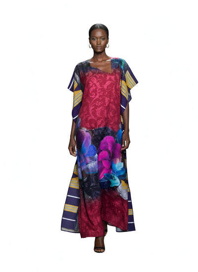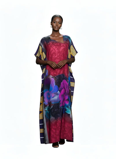 Elevate your wardrobe with the Alari Dress, a striking fusion of contemporary floral art and heritage Nigerian craftsmanship. Crafted from luxurious silk chiffon in a deep magenta palette, it features a glowing orchid motif and a silhouette architecturally framed by handwoven Aso Oke panels.